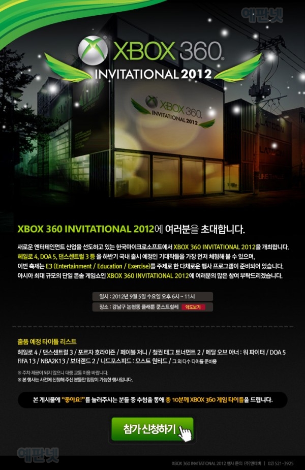 ‘XBOX 360 INVITATIONAL 2012’ 행사는 사전 신청 과정을 통해 참석자를 모집하고 있으며, 참가 신청은 Xbox Kinect Korea 페이스북(https://www.facebook.com/XboxKorea/app_156218351098324) 에서 가능하다.