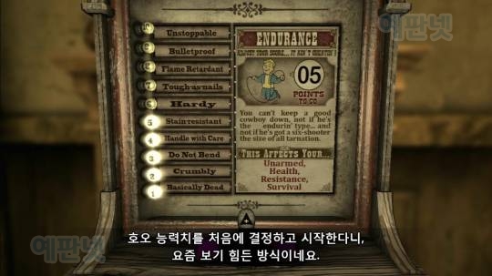 이렇게 대략 1시간 30분동안 제가 플레이한 짧은 폴아웃: 뉴 베가스의 막간리뷰를 보셨습니다. 의외로 전투에 접근하는 방식이 은신, 근접 등 여러가지라서 재밌더군요. 아직 접해보지 못한 세력 평판이나, 여러가지가 기대됩니다.