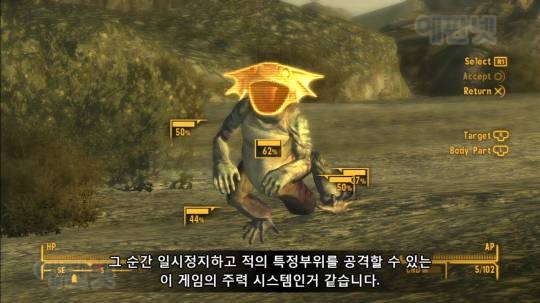 전투의 특징이라면 역시 V.A.T.S 시스템. (볼트텍 보조 표적 지정 시스템) 언제든지 활성화 할 수 있는 이 시스템은 그 순간 일시정지하고 적의 특정부위를 공격할 수 있는 이 게임의 주력 시스템인거 같습니다. 푱푱 맞추면 시네마틱 효과가 나는게 꽤 재밌습니다. 근데 평소에 크로스 헤어가 왜이리 안보이는지.