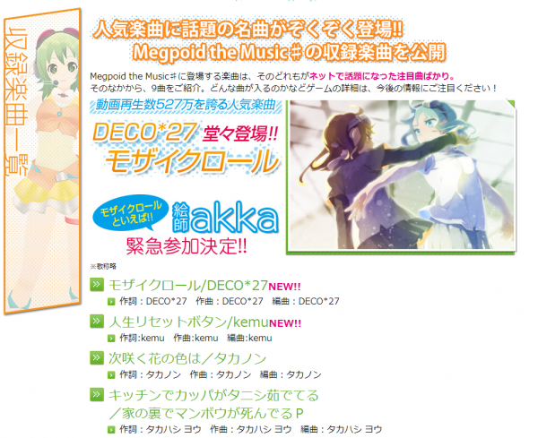 카테고리 없음 메구포이드 더 뮤직 # 공식 사이트 갱신 by yepan 2012. 12. 21. 메구포이드 더 뮤직 # 공식 사이트 갱신출처 : 예판넷 왁스발리 님의 글 일러스트레이터 추가akka수록곡 추가モザイクロール/DECO*27작사:DECO*27 작곡:DECO*27 편곡:DECO*27人生リセットボタン/kemu작사:kemu 작곡:kemu 편곡:kemu메구포이드 더 뮤직 # 공식 사이트 갱신 - by 출처 : 예판넷 왁스발리 님의 글 공유하기 게시글 관리 예약판매 집중탐구 댓글