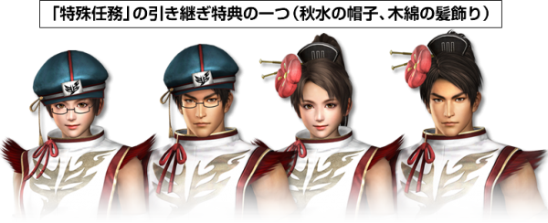특수 임무의 인계 특전 중 하나(슈스이의 모자, 유우의 머리 장식)