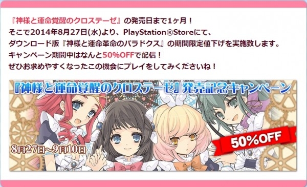 신과 운명혁명의 패러독스 할인 캠페인 실시카테고리 없음 2014. 8. 27. 19:16신과 운명각성의 크로스테제 발매를 기념하여 신과 운명혁명의 패러독스 다운로드판을 50% 할인된 가격으로 판매 기간 2014년 8월 27일~9월 10일 가격 정가 6,171엔--> 캠페인 가격 3,000엔 출처 : 예판넷 신과 운명혁명의 패러독스 할인 캠페인 실시 - 왁스발리 님의 글