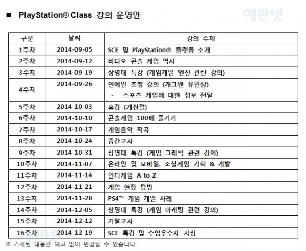 PlayStation® Class는 일회성 특강이 아닌 3학점 정규수업으로 상명대학교 게임 교육 인프라 활용, 외부 게임 전문가 및 SCE 특강 등 총 15회의 커리큘럼으로 진행된다. 9월 5일부터 12월 19일까지 매주 금요일 오후 4시부터 시작되며, 강의 이후 관련 타이틀 시연의 기본 구성으로 오직 PlayStation®에서만 느낄 수 있는 새로운 차원의 가치와 재미를 제공한다. 특히 개그맨 유민상을 포함해 다양한 분야의 게임 전문가들이 매주 금요일마다 전반적인 게임 정보를 전할 예정이다.