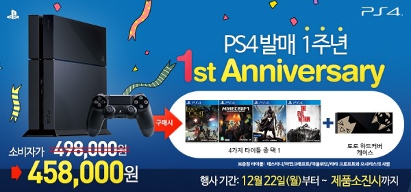 PlayStation®4 발매 1주년 기념 이벤트 소식입니다. 이벤트는 블랙/화이트 색상 모두 해당됩니다. 이벤트 기간 동안 PlayStation®4를 구매하시면 498,000원 -> 458,000원 + 총 4가지 타이틀 중 택 1(데스티니, 마인크래프트, 이블위딘, 라라 크로프트와 오시리스의 사원) + 토로 하드커버 케이스를 무료로 증정해드립니다. 이벤트 기간은 2014. 12. 22 ~ 제품소진시까지이며 한정수량 제품이니 서둘러 구매해주세요.