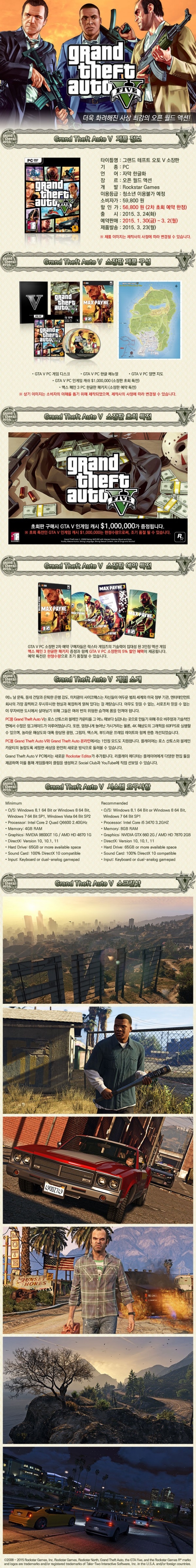 - 초회특전: 인게임 캐쉬 $1,000,000 (GTA V용 $500,000 & GTA온라인용 $500,000)