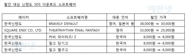할인 대상 다운로드 소프트웨어는 「BRAVELY DEFAULT」(영어, 일본어 등)와 「THEATRHYTHM FINAL FANTASY」(영어), 「커비 파이터즈! Z」(한국어), 「밀고 당기고」(한국어), 「밀고 떨구고」(한국어), 의 5가지이며, 4월 9일(목)부터 4월 12일(일)까지 4일 동안만 각각 기존 가격보다 할인된 가격에 구입할 수 있다.