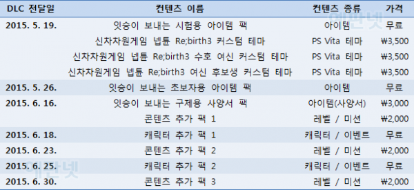 - 메이커 캐릭터 등의 추가 컨텐츠는 2015년 6월 16일부터 3주간 차례로 공개