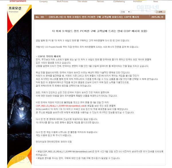 * 메일(CDP_RED_IS_REALLY_SORRY@cdprojektred.com)은 한국 시간 5월 22일 오전 0시 이전까지 보내주시면 추가 안내를 드리도록 하겠습니다.