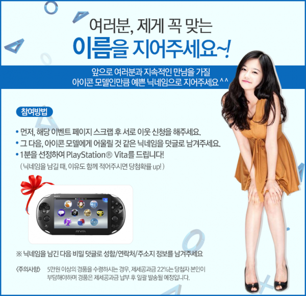 카테고리 없음 PlayStation(R)의 새로운 얼굴인 아이콘 모델, 그녀의 이름을 지어주세요 by yepan 2015. 6. 1. PlayStation(R)의 새로운 얼굴인 아이콘 모델, 그녀의 이름을 지어주세요출처 : 예판넷 왁스발리 님의 글 출처 : 예판넷 PlayStation(R)의 새로운 얼굴인 아이콘 모델, 그녀의 이름을 지어주세요 - 왁스발리 님의 글 공유하기 게시글 관리 예약판매 집중탐구 댓글