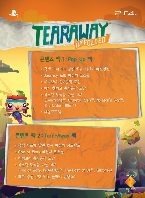 소니컴퓨터엔터테인먼트코리아(SCEK, 대표: 카와우치 시로)는 PlayStation®4 (이하 PS4™) 독점 타이틀 『Tearaway™ Unfolded』 한국어 버전을 2015년 9월 8일 39,800원에 발매한다.