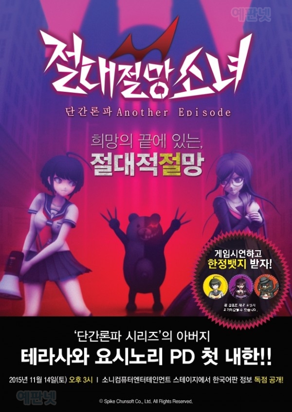 “절대절망소녀 단간론파: Another Episode”는 시리즈 특유의 깊이 있는 스토리와 탐색 요소를 액션 어드벤처라는 장르와 융합하여 재해석한 신작 타이틀. 12월 한국어판 출시를 앞두고 있는 가운데, 이번 G-STAR 2015에서SCEK 부스에 시연 버전을 출품하여 국내 게이머들에게 첫 선을 보이게 됐다.