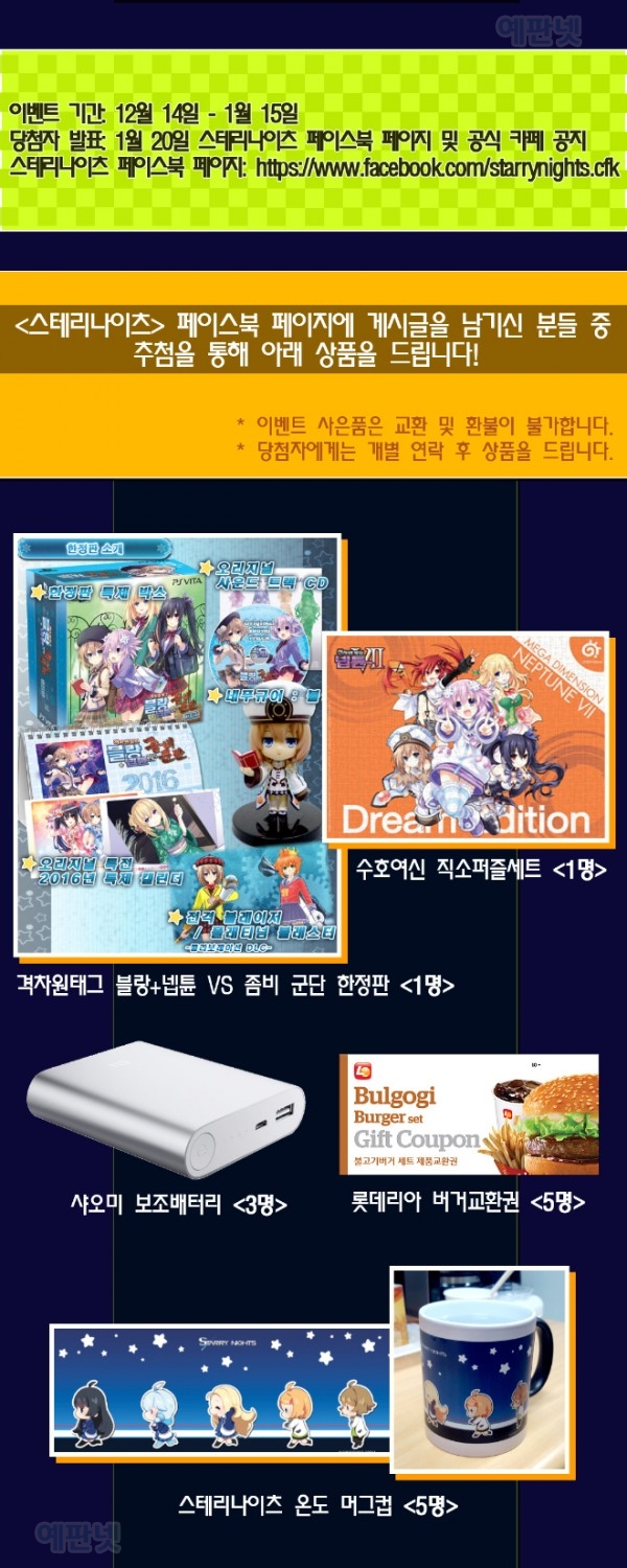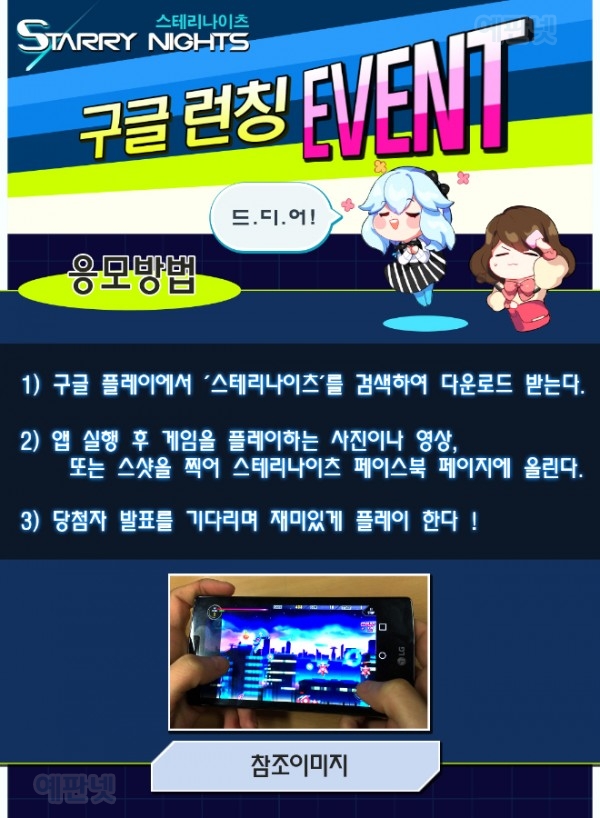 한편, CFK에서는 스테리나이츠의 구글 스토어 런칭을 기념해 유저 참가 이벤트를 진행한다. 이번 이벤트는 스테리나이츠를 플레이하는 누구나 참여할 수 있는 이벤트로, CFK의 신작 타이틀 및 각종 경품을 제공할 예정이다. 이벤트의 참가 방법 및 자세한 사항에 대해선 스테리나이츠 페이스북 페이지(https://www.facebook.com/starrynights.cfk/)를 통해 확인할 수 있다.