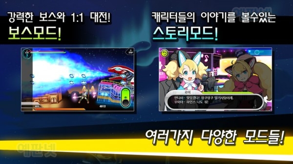 여기에, 자신의 실력을 시험하며 엔딩까지 진행하는 ‘스코어 모드’, 거대 보스와의 대전을 즐기는 ‘맵 모드’와 ‘랜덤 모드’, 여기에 게임 내 세계관과 캐릭터들의 매력을 한껏 느낄 수 있는 ‘스토리 모드’가 준비되어 있다. 특히 ‘스토리 모드’는 기존에 볼 수 힘든, 텍스트 어드벤처 느낌으로 진행되는 또 하나의 게임으로 게임을 진행하면 할수록 다음 스토리가 개방되며 흥미진진한 전개가 기다리고 있다.