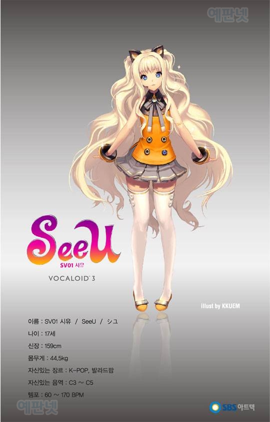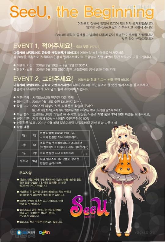 카테고리 없음 한국어 보컬로이드 캐릭터 공개및 이벤트 안내 by yepan 2011. 9. 1. 한국어 보컬로이드 캐릭터 공개및 이벤트 안내출처 : 예판넷 예판넷 님의 글 한국어 보컬로이드 캐릭터가 8월 30일 공개되었습니다.이름은 시유 (SV01 SeeU)한국어 보컬로이드는, 한국과 일본동시에 10월 공개 예정입니다.이와 함께 이벤트도 진행중입니다!이름있는 기업인 SBS 아트텍에서 추진중인만큼 좋은 결과가 나오기를 바랍니다!!한국어 보컬로이드 캐릭터 공개및 이벤트 안내 - by 출처 : 예판넷 예판넷 님의 글 공유하기 게시글 관리 예약판매 집중탐구 댓글