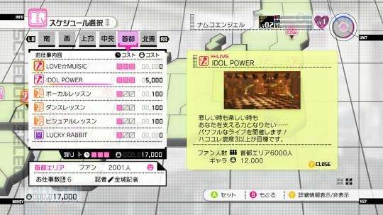 그룹의 악곡을 발매하여 매주 갱신되는 “전국 순위”를 확인한다. 팬이 늘어나면 신곡 판매를 통해 순위 상승을 노리자. 아이돌들의 재능과 운을 끌어낼 “아이돌 아카데미 대상”의 노미네이트 조건! 즉, 전국 랭킹 20위 내에 들자!