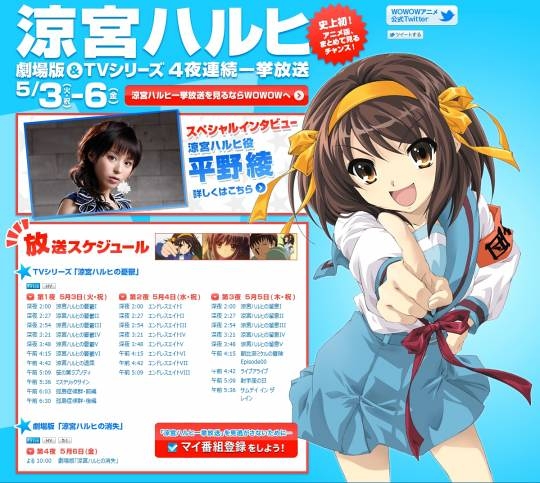 | WOWOW 5월 3일 ~ 5월 6일 스즈미야 하루히 방송 스케쥴 - by 왁스발리 예판넷에서 퍼온 글입니다. |