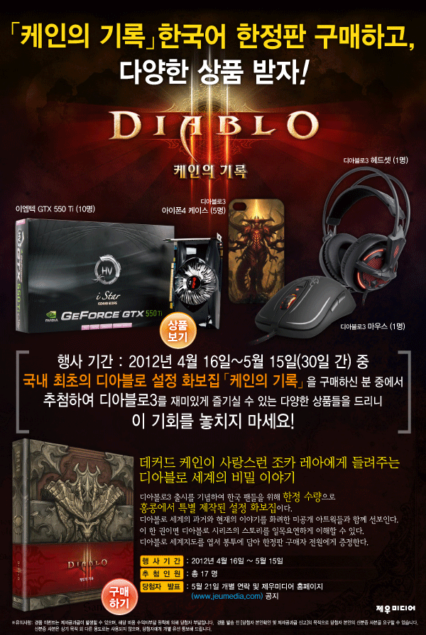 4월 16일 부터 5월 15일(30일간)까지 구입자 전원에게 엽서봉투에 담겨진 디아블로 세계지도를 증정하며, 추첨을 통해 추가적으로 푸짐한 상품을 증정한다.