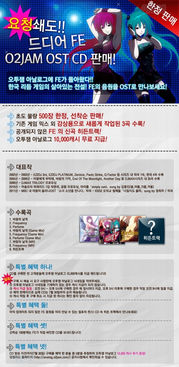 또한 사전 예약판매 이벤트로 선착순 100명에게는 FE가 직접 사인한 CD가 제공되며, 오투잼 아날로그 10,000 캐쉬와 추첨을 통한 추가 캐쉬를 제공한다고 합니다.