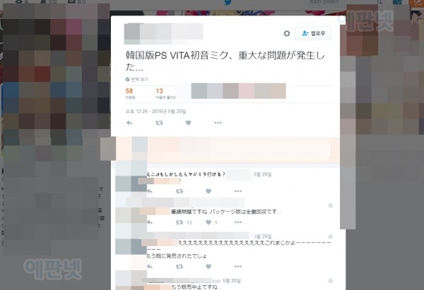 트위터에서 한국에서 판매 중단 트윗이 (한국인 H모님의 일본어 트윗) 확인 되었고 ,세가 팀 中の人(1号)(@nakanohito_1go)가 소식을 알리면서 일본에서도 관심. 현재로써는 정확한 것은 알 수 없지만, 12세 심의 통과 후 가사에 문제가 발견되어 판매중 심의 등급이 보류 되었으며, 패키지판 판매 중지 결정. 聖槍爆裂ボーイ (성창폭렬보이)의 가사가 문제시 된 가능성이 있는 것 같음. 표현규제 문제는 일본도 동일해서, PS3 메루루의 아틀리에 사건과 비슷하다는 의견도, FF IX 음주 씬으로 성인등급을 받는 등의 문제도 언급