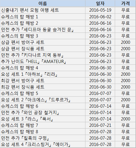 - 슈케스의 탑, 새로운 던전 추가와 새로운 요성, 아이템이 DLC로 등장.