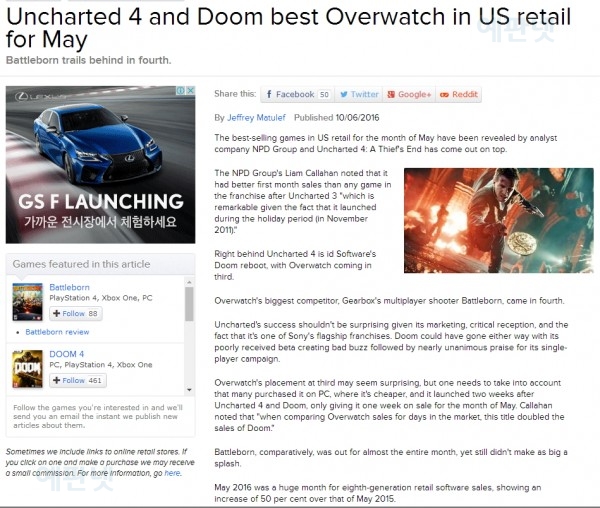 5월 북미 판매량 랭킹 TOP 10 - 1위 언챠티드(PS4), 2위 둠 (PS4,XB1,PC) , 3위 오버워치(PS4,XB1,PC)카테고리 없음 2016. 6. 10. 10:16