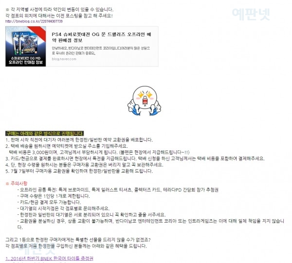 더 많은 실시간 링크 안내, 무료SMS알람신청 은 예판링크 바로가기 클릭하세요 PS4 슈퍼로봇대전OG 오프라인 예약판매 수량및 방법 상세 정보카테고리 없음 2016. 6. 29. 11:50
