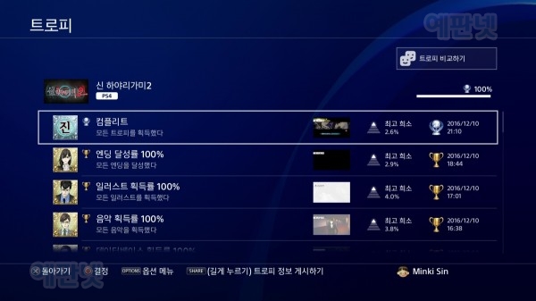 올 트로피 조건에는 음악 100%, 일러스트 100% 같은 것이 있는데, 이것은 게임 내에 있는 모든 스토리를 진행하기만 하면 따집니다. 또한, 게임 내에 존재하는 스토리를 전부 보셨다면 약 3시간 안에 올 트로피를 획득하실 수 있습니다. 트로피 난이도가 매우 낮으며, 게임 자체가 재밌고 쉽게 딸 수 있기 때문에 뭐 이렇게 쉽냐는 생각이 들 정도입니다.